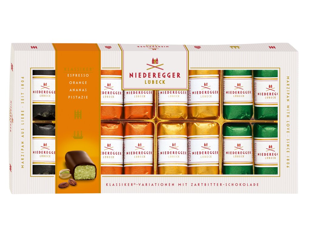 S variacemi marcipánu Niederegger rozdáváte čisté štěstí. Protože dárkové balení s šik designem ukrývá jemné marcipánové čokolády ve 4 různých variantách. Zakousněte se do něj a zažijte chuť jemné pistácie, ovocného pomeranče, exotického ananasu a silného espressa, zatímco poleva z jemné hořké čokolády vás sofistikovaně svede.