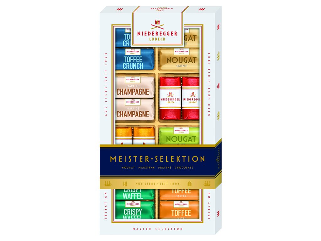 Cukr, lískové ořechy 29%, kakaové máslo, sušená smetana 6.5%, sušené mléko, kakaová hmota, laktóza, emulgátor: sójový a slunečnicový lecitin, karamel, vanilkový extrakt, vanilkový prášek, mandle 35%, hořkomléčná čokoláda 29% (kakaová hmota, cukr, kakaové máslo, sušené plnotučné mléko, emulgátor: sójový lecitin, vanilkové aroma), cukr, invertní cukrový sirup, pistácie 4.2%, ananas 2.2%, alkohol, ananasový prášek (ananas, maltodextrin), šumivý nápoj arrack, přírodní ananasové aroma, glukózo-fruktózový sirup, okyselovač: kyselina citronová, mléčná čokoláda 43%, (cukr, kakaové máslo, plnotučné sušené mléko, kakaová hmota, emulgátor: sójový lecitin, vanilkové aroma), hořká čokoláda 23% (kakaová hmota, cukr, kakaové máslo, plnotučné mléko sušené, emulgátor: sójový lecitin, vanilkový extrakt) smetana 12%, bíla čokoláda (cukr, kakaové máslo, sušené plnotučné mléko, emulgátor: sójový lecitin, vanilkový extrakt), kondenzované odtučněné mléko, přírodní aromata, alkohol, brandy, máslo, Marc de Champagne 0.8%, sušené odstředěné mléko, přírodní vanilkové aroma, invertáze.