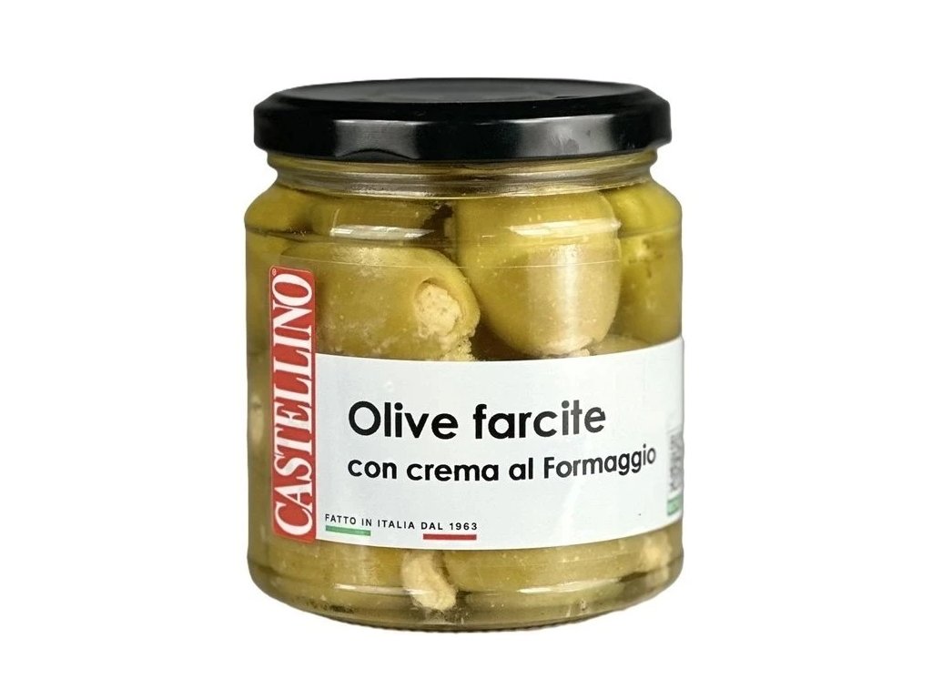 zelené olivy bez pecky 54%, slunečnicový olej, náplň 8% [česnek, ovčí sýr Pecorino Romano DOP 3% (ovčí mléko, sůl, syřidlo), bramborová moučka, strouhanka (pšeničná mouka, sůl, droždí)], sůl, regulátory kyselosti: kyselina mléčná a kyselina citrónová, antioxidant: kyselina askorbová